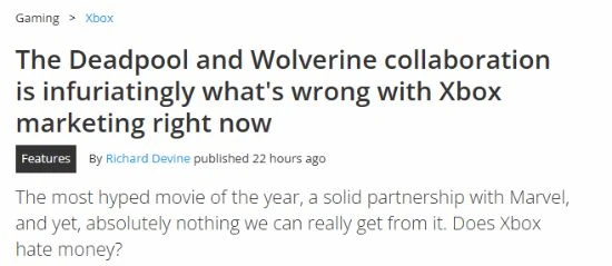 近日,外媒windowscentral的編輯Richard Devine因此事撰寫了一篇文章,並表達了自己的一些看法。Richard Devine認為,《死侍與金剛狼》是今年備受關注的電影之一,微軟與漫威建立了穩固的合作夥伴關係,但粉絲們卻無法真正從中得到好處。「Xbox討厭錢嗎?」Richard Devine說道。