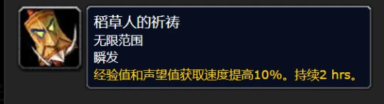 另外,在幽暗城西邊的萬聖節營地處,每天晚上8點開始焚燒稻草人慶典,一直到次日早上6點。玩家還可以通過撿灰燼獲取一個節日buff,叫做稻草人的祈禱,提高經驗值和聲望值的獲取速度10%。聯盟玩家過去也可以獲得。