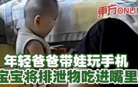 年輕爸爸帶娃玩手機 寶寶將排泄物吃進嘴裡