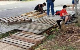 學校外候車亭溝渠上的木板有洞 獲家教協會進行修補