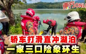 轎車打滑直衝湖泊 一家三口險象環生
