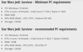 《星戰絕地:倖存者》PC配置泄露 最低需GTX1070